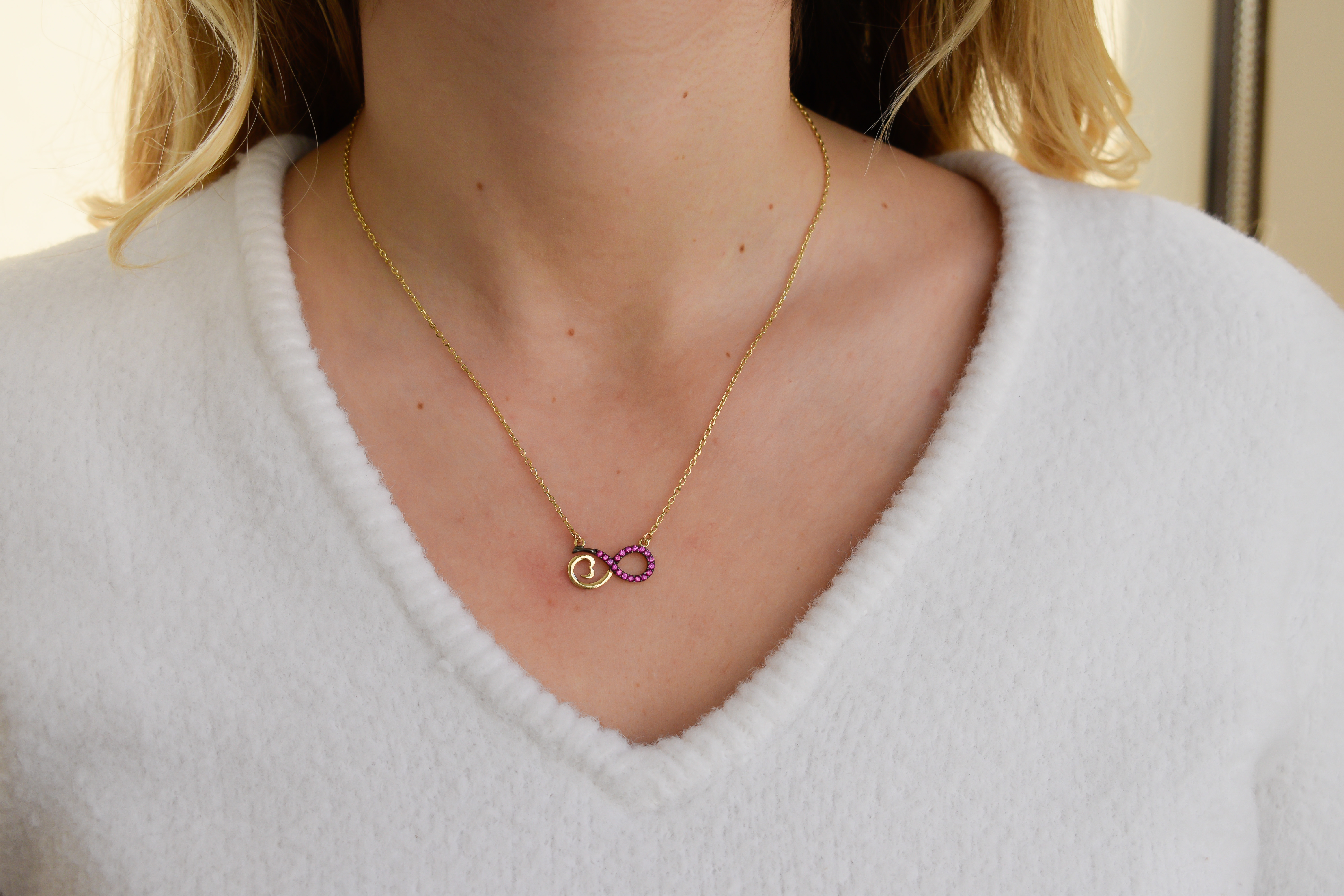 Κολιέ χρυσό 14 καρατίων με κόκκινα ζιργκόν σε σχήμα άπειρο"