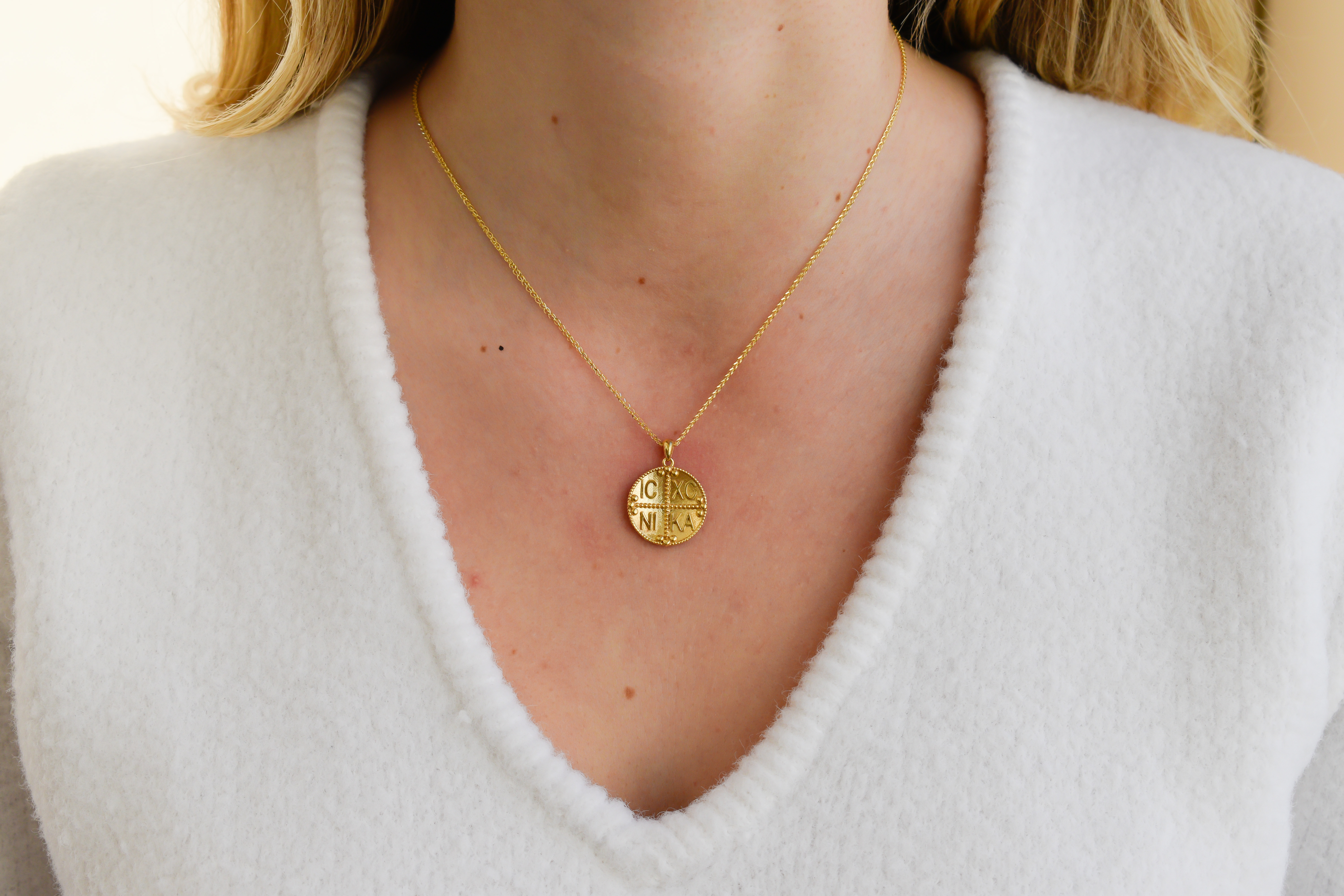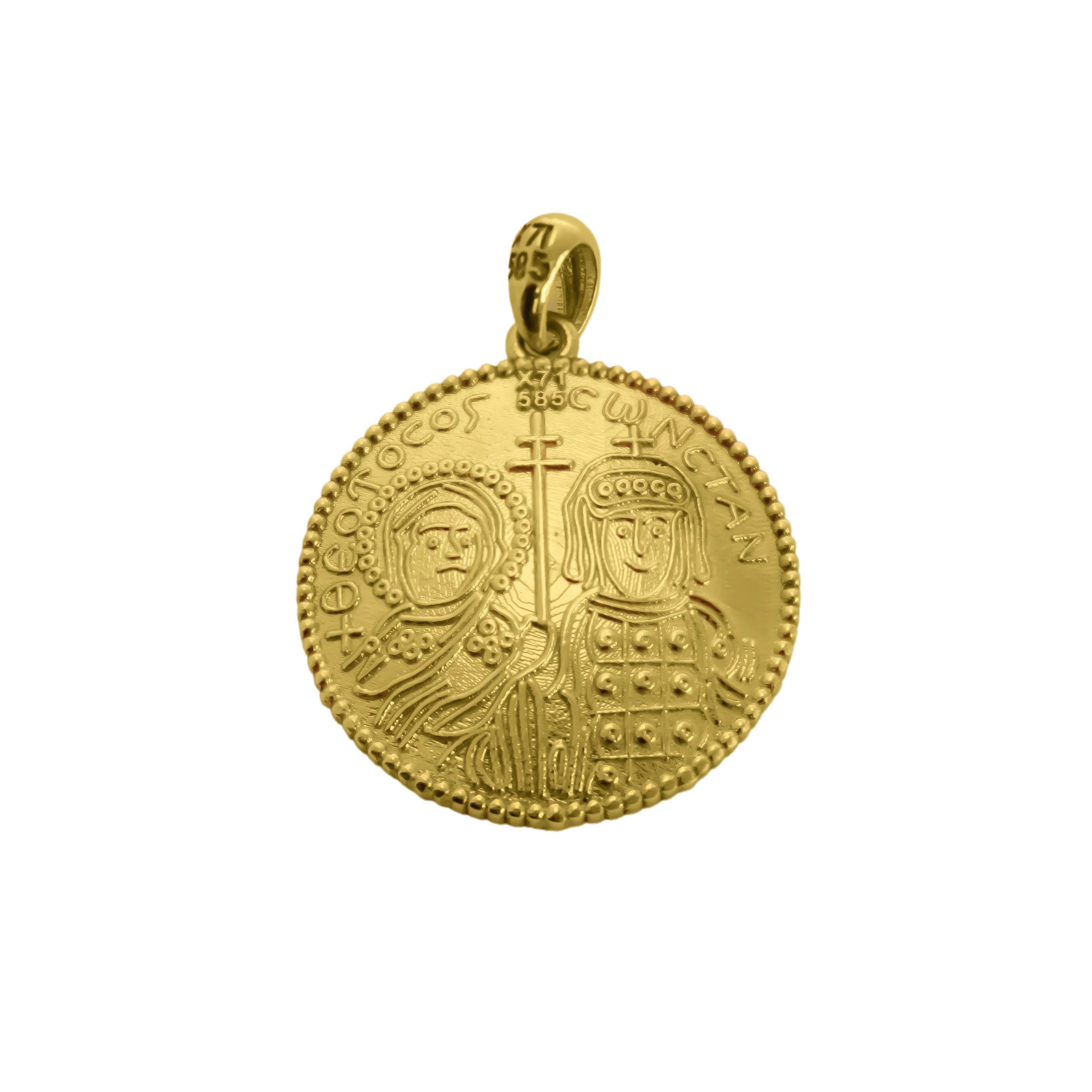 2-Sided Gold coin byzantine made of 14k gold in round shape with illustration of Saint Constantine & Helen and IC/XC/NIKA.