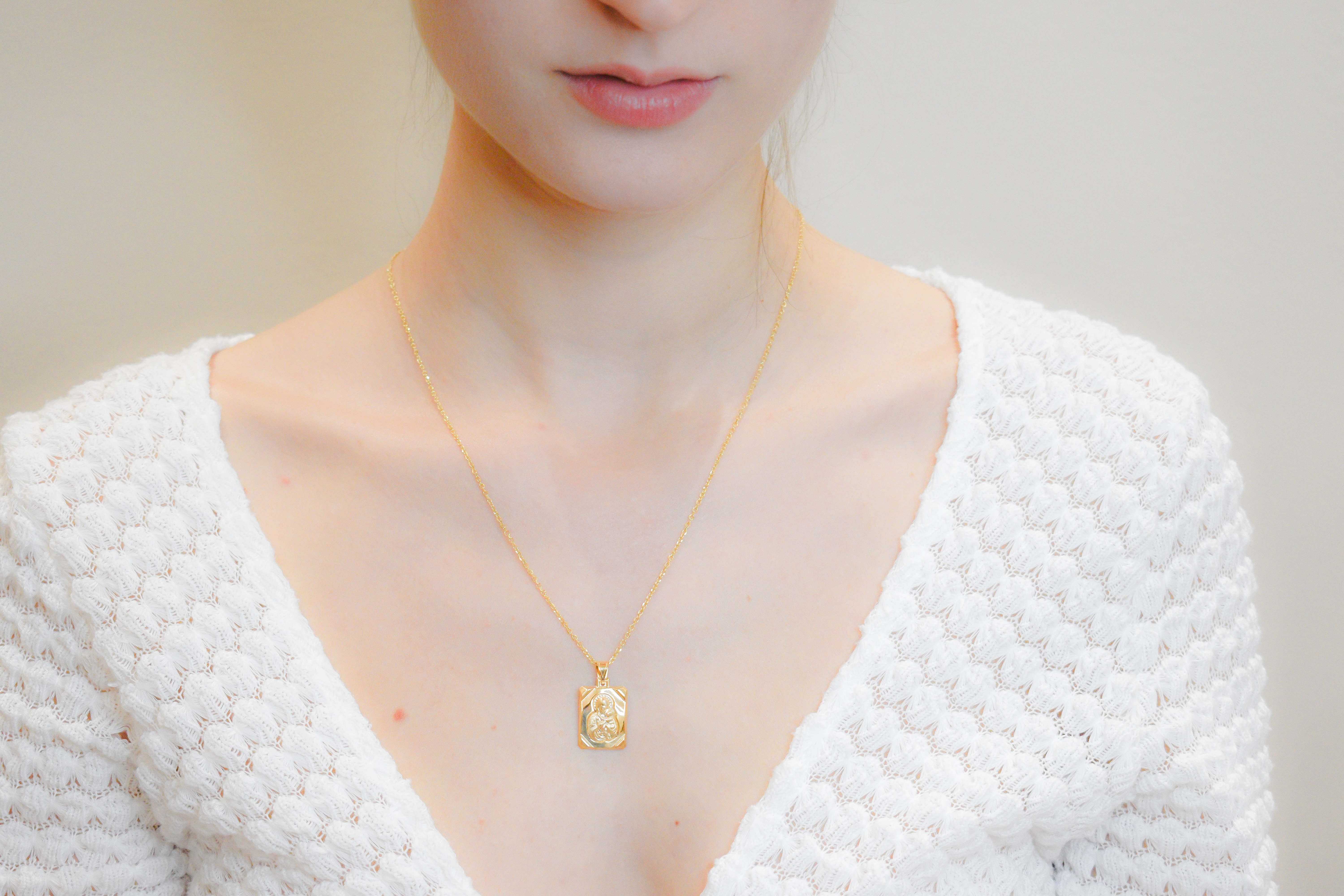 Χρυσό κόσμημα σε παραλληλόγραμο σχήμα με απεικόνιση την Παναγία με τον Χριστό, κλασικό και ευκολοφόρετο κόσμημα .