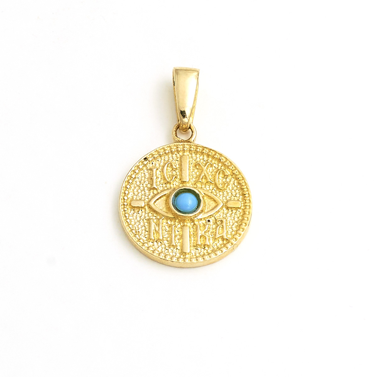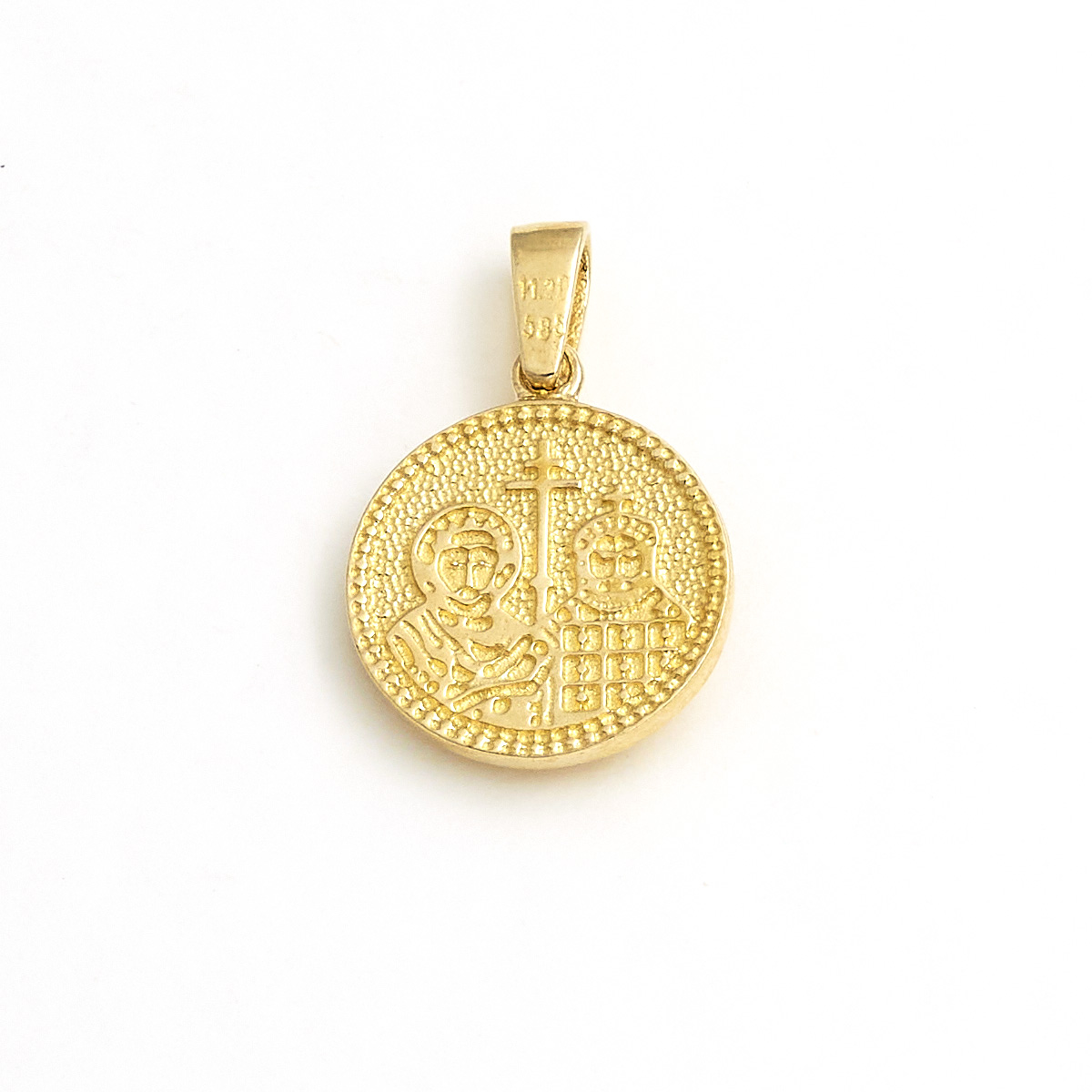 Κωσταντινάτο από χρυσό 14 καρατίων, διπλής όψεως.Στην μία όψη υπάρχει η παράσταση IC/XC/NI/CA με ματάκι και από την άλλη όψη οι Άγιοι, Κωνσταντίνος, Ελένη.