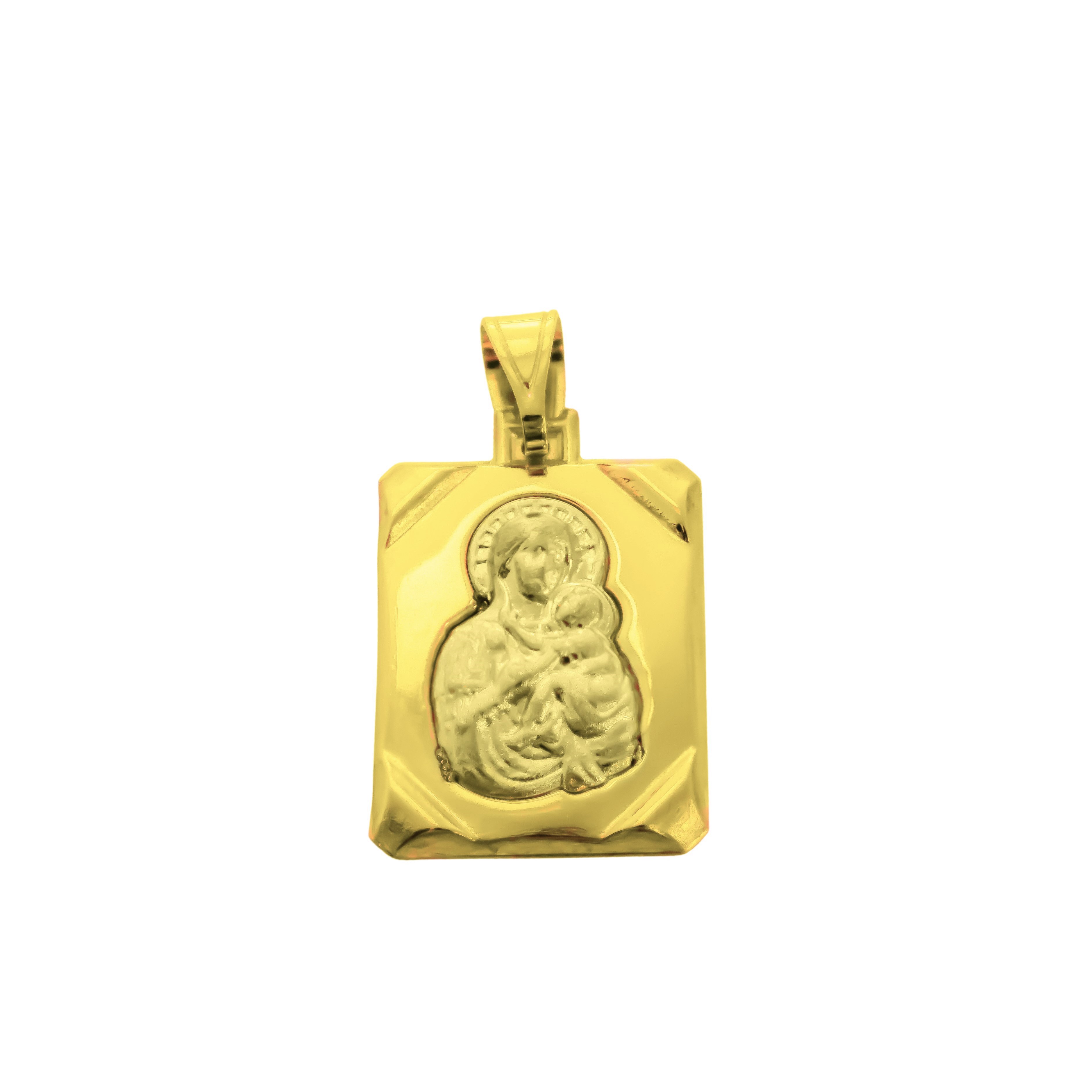 Χρυσό κόσμημα σε παραλληλόγραμο σχήμα με απεικόνιση την Παναγία με τον Χριστό, κλασικό και ευκολοφόρετο κόσμημα .